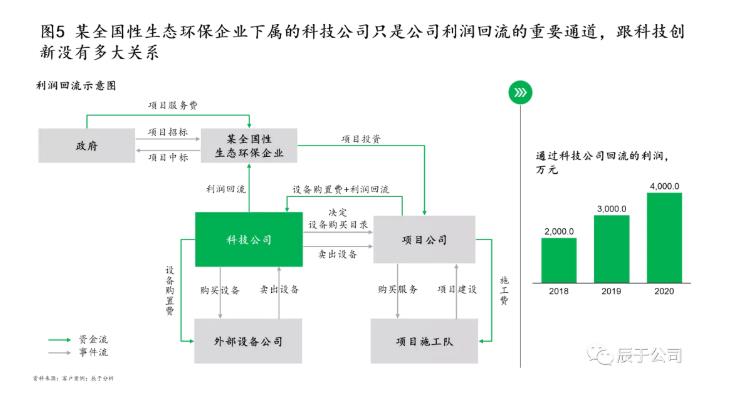然而实际情况是:这些技术公司要么是“扶不起的阿斗”,经营多年,干的仍然主要是公司内部的那些业务,有些甚至“只外包不实干”,成为名副其实的“二道贩子”,徒增成本之外,对企业没有太多增值(见图5);要么是“眼睛全往外看”,一心想的是如何开拓外部市场,对公司内部的业务“不闻不问不参与”,例如针对一家全国性生态环保企业的调研发现,下属技术公司超过80%的技术人员都在做外部市场,只有不足20%的人偶尔会参与内部项目,8条业务线只有1条业务线形成了标准化的技术方案。
