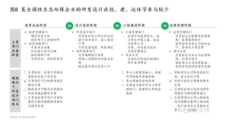 我们也发现,很多生态环保企业的“投技建运”存在脱节,“技”在“投、建、运”等环节的参与度不高,未给与充分的专业支持,不论是投资论证过程中的技术方案编制、还是工程建设阶段的技术质量验收、关键设备验收以及工艺技术指导等,仍有相关工作要做(见图8)。近年来随着国内环保企业规模迅速扩张,这些问题似乎变得越来越严重。